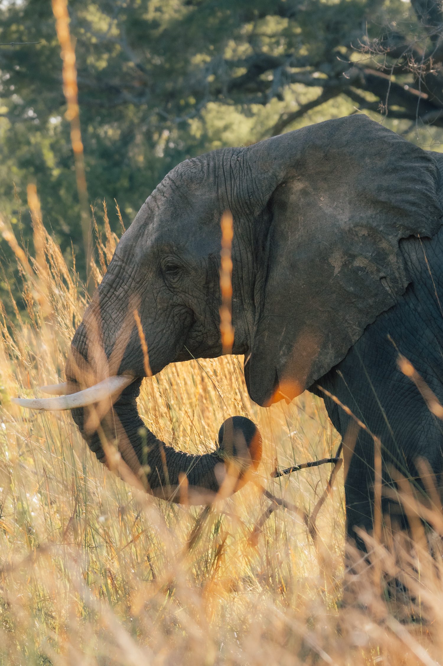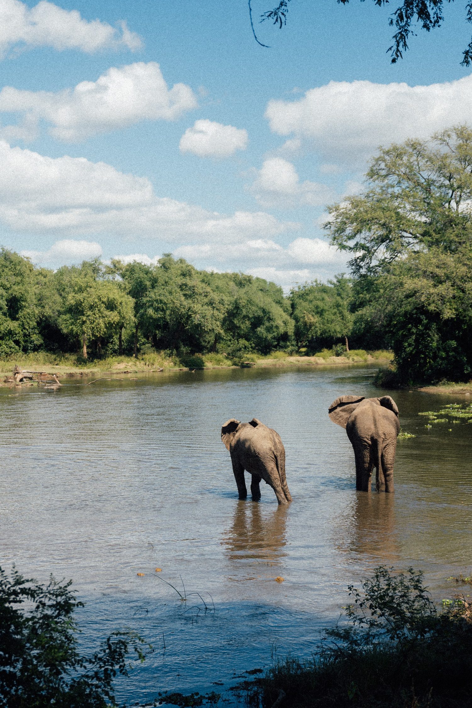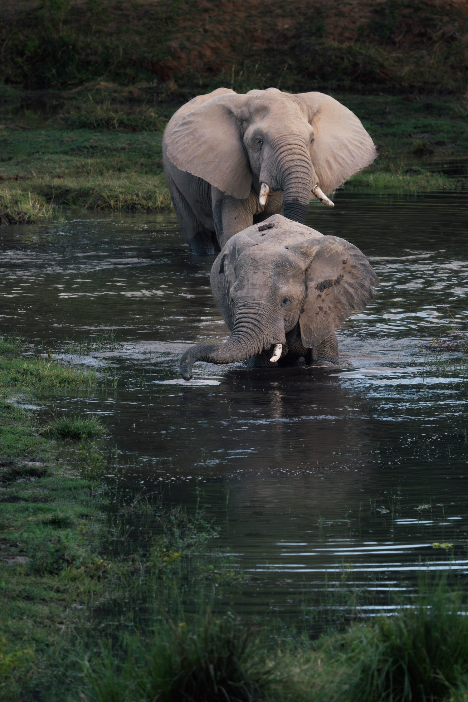 We decided to take the opportunity and do the transfer by boat instead of by car. This gave us an extra activity in the late morning hours. When coming close to Chula Camp we already spotted elephants at the shoreline of one of the islands in the river. We approached carefully and couldn’t believe how close we could get to the three large elephant bulls, without them even lifting a brow. Quite the opposite – they actually decided to head into the water and play in the river right in front of us. It looked like they were practicing mating rituals with each other that day and we enjoyed this sighting to the fullest.