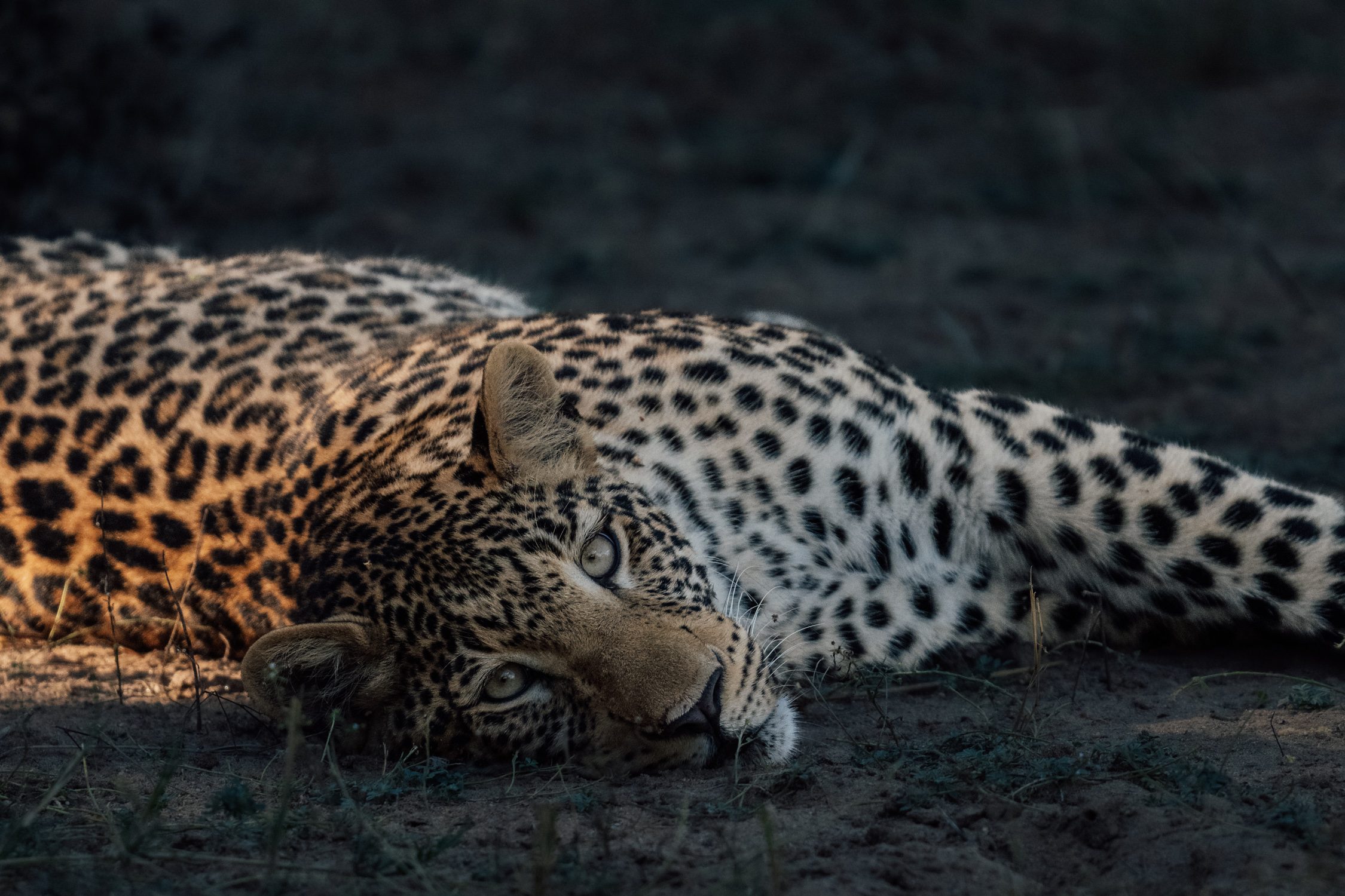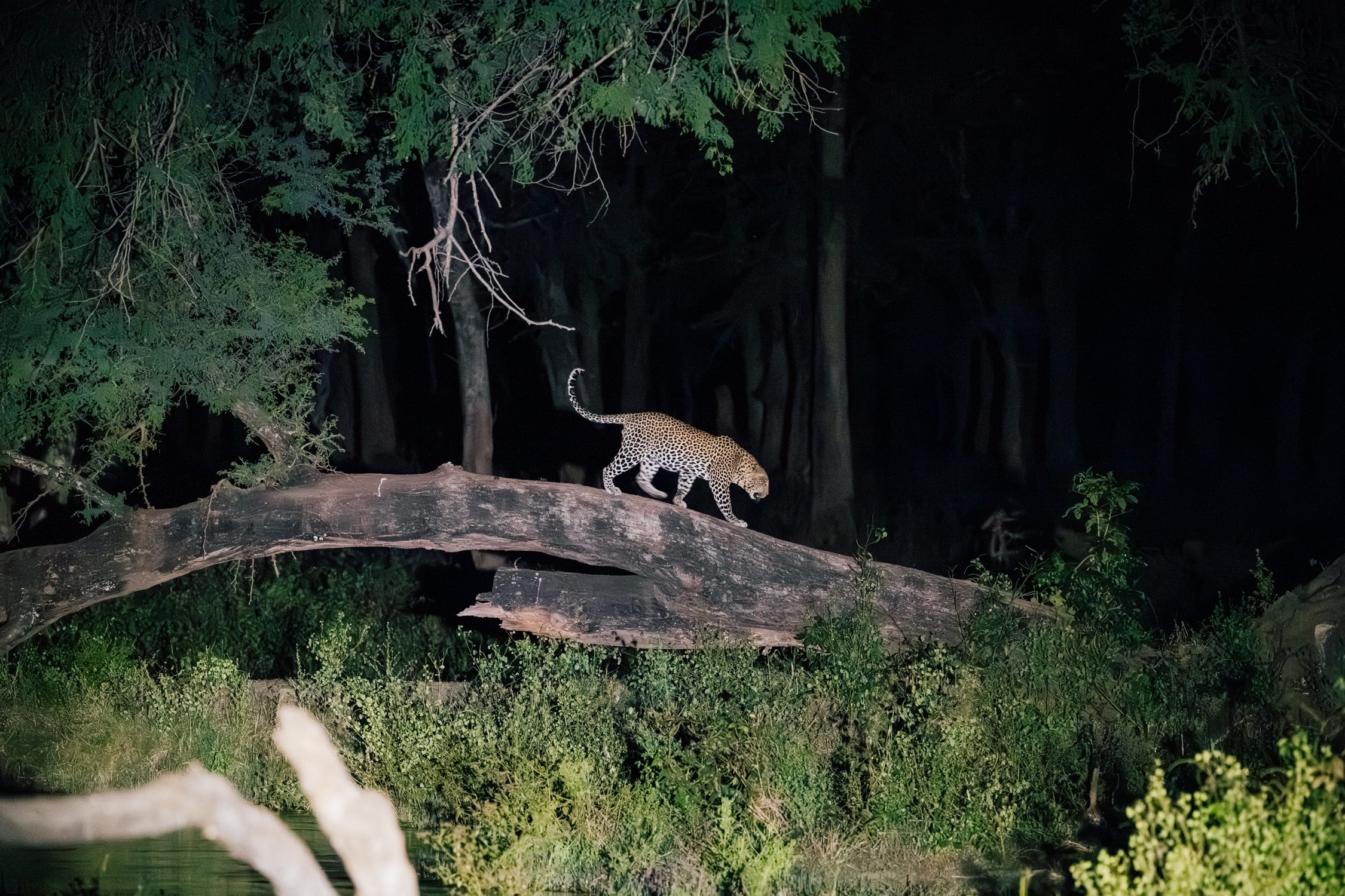 As night fell we made our way back to camp. That’s one of the specialties of Zambia, night drives are always part of the safari. Only minutes into the drive we encountered a hyena followed by a female leopard named “MSF8” (or more aptly called “Kinky Tail” by guides due to her, well, kinked tail). Little did we know at this stage that she had welcomed a cub not too long ago.