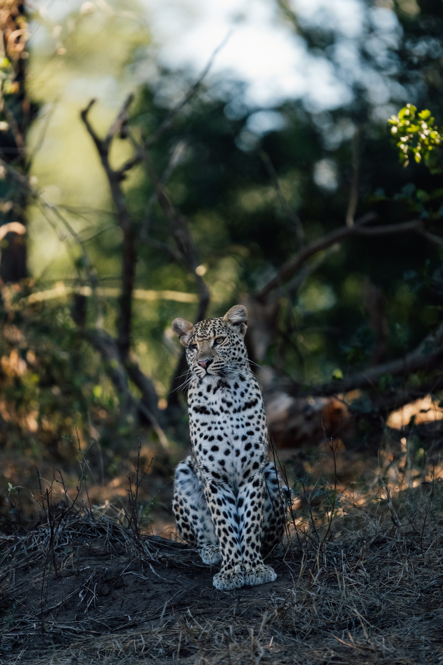 After a short bush breakfast our guides decided to check for the last location where we saw Kinky Tail the night before. Our two vehicles split up and well, let’s just say one group was lucky enough to not only spot Kinky Tail, but also her new cub when they arrived. Seeing a leopard cub is such a treat and I was very happy for the group. When we came a few minutes later the cub had retreated to the den and so we only enjoyed Kinky Tails presence for a while.